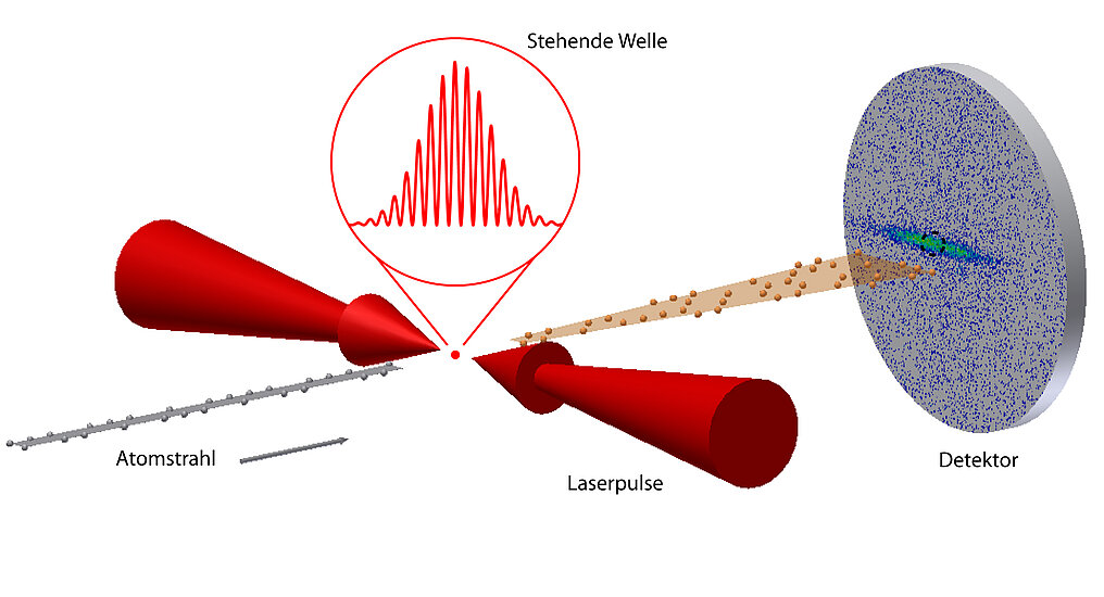 Abb. 1 Skizziert ist der apparative Aufbau. Ein gebündelter thermischer Strahl von Heliumatomen wird einem stehenden Lichtfeld ausgesetzt, das durch Interferenz zweier gegenläufiger Laserpulse für ungefähr 40fs über einen Raumbereich von ∼20 µm erzeugt wird. Die Ablenkung des Atomstrahls wird mit einem ortsempfindlichen Detektor gemessen, wobei der Auftreffort eines jeden einzelnen abgelenkten Heliumatoms gemessen wird. Ohne die Kräfte der stehenden Welle bestünde das Detektorsignal nur aus einem kleinen Fleck in der Mitte, erzeugt durch nicht abgelenkte Heliumatome (gestrichelter Kreis). Tatsächlich wird aber eine breite Verteilung gemessen, wie auf dem Detektorbild ersichtlich ist. Wie kann man sich die Kräfte, die auf das Atom wirken, vorstellen? Atome in einem laufenden Lichtfeld, in dem sich die elektromagnetischen Felder periodisch im Ort und in der Zeit auf- und abbauen, erfahren keine beschleunigenden Kräfte. Dieses ähnelt einem schwimmenden Objekt auf einer Wasseroberfläche, das von einer Welle zwar periodisch auf und ab bewegt wird, aber seine horizontale Position im Wesentlichen nicht ändert. Friert man Wellenberge und –täler hingegen kurzfristig ein, so wie auch die elektromagnetischen Felder in der stehenden Welle kurzfristig ortsfest sind, so kann man sich leicht vorstellen, dass das Objekt in Richtung Wellental hinunterrutscht. Beschleunigt wird es in diesem Fall durch die Schwerkraft, die im atomaren Fall durch die ponderomotive Kraft ersetzt wird.