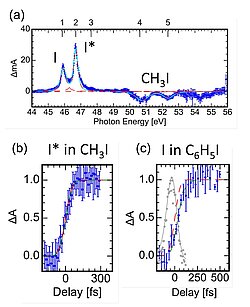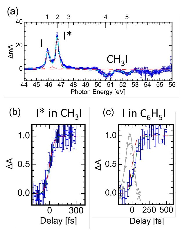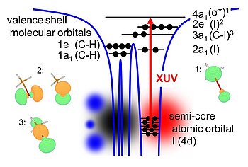 In dem von Drescher et al. am MBI ausgeführten Experiment wurde die Photodissoziation von Iodmethan (CH3I) und Iodbenzol (C6H5I) mittels transienter XUV-Absorptionsspektroskopie untersucht (siehe Abb. 2). Diese beiden Moleküle unterscheiden sich durch den Bindungspartner des Iodatoms; in einem Falle ist dies eine Methylgruppe (CH3), im anderen Falle eine Phenylgruppe mit dem charakteristischen Kohlenstoffring (C6H5). Absorption eines UV-Femtosekundenpulses führt zum Brechen der Bindung zwischen dem Iod- und dem benachbarten Kohlenstoffatom und damit zur Erzeugung von atomarem Iod. Untersucht wurde dies durch Absorption an der N4,5-Kante des Iodatoms. In beiden Molekülen verschwinden die molekularen Kern-Valenzschalenübergänge bei UV-Absorption innerhalb der experimentellen Zeitauflösung. Die zum atomaren Iod hin konvergierenden Übergänge erscheinen unverzüglich im Falle von CH3I, jedoch zeitverzögert im Falle von C6H5I. Im Falle von CH3I wurde diese Beobachtung als die UV-Erzeugung einer Vakanz in der Valenzschale interpretiert, die in der Nähe des Iodatoms lokalisiert ist. Damit ergibt sich eine hohe Wahrscheinlichkeit für einen XUV-Übergang aus dem Kernzustand des Iodatoms. Das Experiment zeigt, wie die Valenzschale während der Dissoziation des Moleküls relaxiert. Dabei wird eine kontinuierliche Verschiebung der Übergangsenergie der zum atomaren Iod hin konvergierenden Übergänge gemessen. In Falle von C6H3I hingegen weist das zeitverzögerte Erscheinen der Absorptionsübergänge auf eine UV-erzeugte Vakanz hin, die ursprünglich innerhalb des Moleküls räumlich entfernt vom Iod-Reporteratom lokalisiert ist. Damit ist die Wahrscheinlichkeit für einen Kern-Valenzschalenübergang gering. Die Vakanz muss zuerst durch das Molekül wandern, bevor sie beobachtet werden kann. Dieses Verhalten ist der dominanten π → σ* UV-Anregung in Iodbenzol zuzuschreiben, eine Folge des charakteristischen delokalisierten Elektronensystems im Kohlenstoffring.