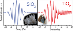 Abb 1 Reaktion von SiO2 und TiO2 auf ein kurzes gepulstes Lichtfeld. In SiO2 folgt die Auslenkung der Elektronenhülle dem Feld. Nach Abklingen des Pulses endet auch unmittelbar diese Oszillation. In TiO2 beobachtet man hingegen, dass sich bei der dritten Harmonischen des Anregungsfeldes resonant eine Oszillation aufschaukelt, die auch nach Ende der Anregung fortbesteht für beide Materialen sind Bilder kristalliner Modifikationen als Einschub gezeigt (Fotos von Didier Descouens, CC BY 3.0 und Rob Lavinsky, CC-BY-SA-3.0).