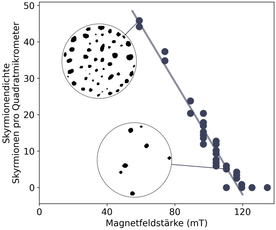 Angesichts der thermischen Natur des Prozesses ist es nicht überraschend, dass die Laserintensität gut gewählt sein muss. Es gibt ein materialabhängiges Fenster von Laserintensitäten zur Erzeugung eines neuen Skyrmionenmusters, das völlig unabhängig vom vorherigen magnetischen Zustand ist. Bei niedrigeren Intensitäten bleibt ein bestehendes Muster unverändert oder wird nur geringfügig verändert, bei viel höheren Intensitäten wird die Mehrschichtstruktur beschädigt. Bemerkenswert ist, dass die Anzahl der Skyrmionen, die innerhalb des Laserfokus‘ entstehen, nicht von der Laserintensität beeinflusst wird. Jedoch fanden die Forschenden heraus, dass sich die Dichte der erzeugten Skyrmionen durch das Vorhandensein eines externen Magnetfeldes präzise steuern lässt. Die Stärke des externen Feldes bietet somit einen „Steuerknopf“, um die Anzahl der erzeugten Skyrmionen einzustellen und ermöglicht sogar die Vernichtung von Skyrmionen, wie die Wissenschaftler*innen in der Zeitschrift Applied Physics Letters berichten.