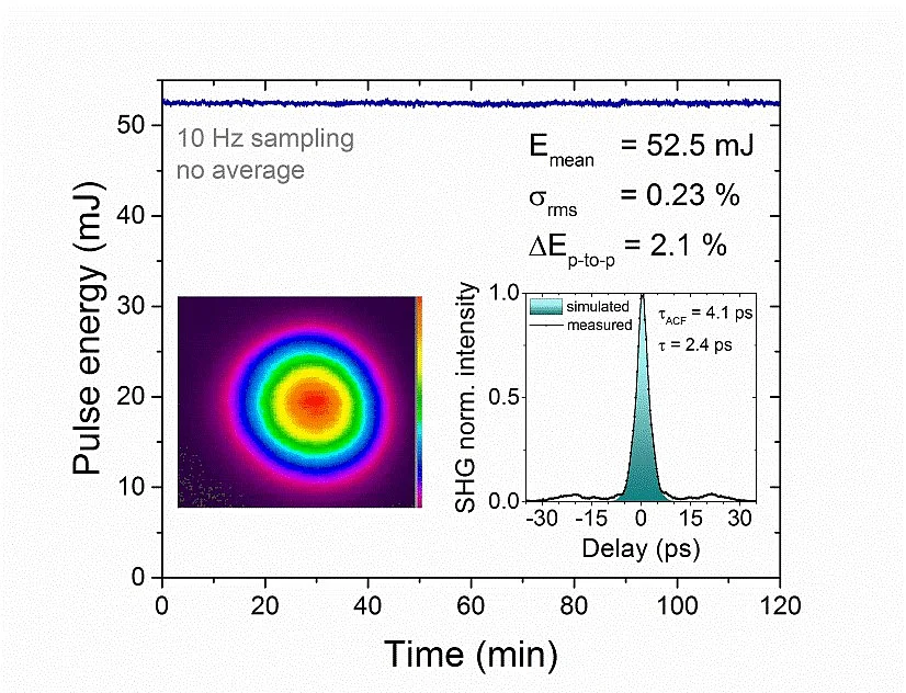 Die Energie der verstärkten rekomprimierten Impulse beträgt 52,5 mJ mit einer exzellenten Stabilität von <0,23% rms. Die Langzeitstabilitätsmessung ist zusammen mit dem Strahlprofil der Impulse in Abb. 1 gezeigt, der Strahlparameter M2 hat einen Wert von 1,2. Das Impulsspektrum ist bei einer Wellenlänge von 2,05 µm zentriert, seine Bandbreite beträgt 3,5 nm (FWHM). Dies erlaubt eine Fourier-limitierte minimale Impulsdauer von ~1,7 ps. Die Kompression der Impulse erfolgt in einer Treacy-Gitteranordnung mit einem Wirkungsgrad von >93%. Die gemessene Autokorrelation der Impulse (ACF) besitzt eine FWHM von 4,1 ps. Die Analyse der Autokorrelationsmessung liefert eine Impulsdauer von 2,4 ps (FWHM), worin sich 85% der Energie befinden. Daraus ergibt sich eine Impulsspitzenleistung von 17 GW. Diese Leistung und die Impulsenergie von mehr als 50 mJ sind die höchsten jemals mit Pikosekunden-Impulsen bei 2 µm Wellenlänge erreichten Werte.