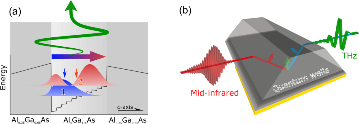 Der grundlegende Mechanismus der THz-Erzeugung ist in Abb. 1 dargestellt. Elektronen sind in einem quasi-zweidimensionalen Quantentrog eingeschlossen, der entlang der Stapelachse der AlxGa1-xAs-Halbleiterschichten (c-Achse) asymmetrisch ist. Auf Grund der geringen Breite des Quantentrogs entstehen die Quantenzustände 1 und 2 der Elektronen, die jeweils der Minimalenergie von Elektronen in den entsprechenden sog. Subbändern entsprechen. Die asymmetrische Form des Potentials entlang der c-Achse führt zu räumlich gegeneinander verschobenen Wahrscheinlichkeitsverteilungen der Elektronen in den beiden Subbändern. Eine Anregung von Elektronen aus Subband 1 in Subband 2 mittels eines ultrakurzen Lichtimpulses im mittleren Infrarot verschiebt den Schwerpunkt der gesamten Dichteverteilung der Elektronen um einige Nanometer, was einem zeitabhängigen elektrischen Strom entspricht. Nach den Gesetzen der Elektrodynamik emittiert dieser sog. Verschiebestrom ein elektrisches Feld. Bei Verwendung eines Femtosekunden-Impulses zur Anregung liegt die Frequenz des emittierten Feldes im THz-Bereich.