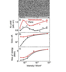 Das Team um Dr. Matthias Schnürer vom Max-Born-Institut in Berlin hat nun untersucht, unter welchen Bedingungen der Einsatz von nanostrukturierten Targets vorteilhaft ist. Dazu haben die Physiker die Targets in-situ mit dem Laser strukturiert. Diese Methode der Erzeugung laser-Induzierter periodischer Oberflächenstrukturen ist besonders einfach und erlaubt im Prinzip, wie die Physiker betonen, auch die Entwicklung eines hochrepetitierenden Targetsystems. In einem ersten Schritt wird die Oberfläche mit dem abgeschwächten Laser strukturiert (etwa 20 Impulse). Eine Rasterelektronenmikroskopieaufnahme der so strukturierten Fläche ist in Abb. 2 zu sehen. Strukturanalyse und Simulationen zeigen, dass die Strukturen nahezu optimale Parameter für eine maximale Laserabsorption aufweisen. Im folgenden Schritt wird dann der volle Laserpuls auf diese strukturierte Fläche fokussiert. Dr. Andrea Lübcke und ihre Kollegen haben diese Untersuchungen für verschiedene Laserintensitäten und bei einem Laserkontrast durchgeführt, der bei maximaler Laserintensität optimal ist. Zunächst konnte gezeigt werden, dass die Nanostrukturen bei diesen Kontrastverhältnissen auch bei höchsten Intensitäten zu einer Erhöhung der Laserabsorption und damit der Kα-Ausbeute führen (siehe Abb. 2a). Für relativ kleine Intensitäten konnten die Nanostrukturen sowohl die Konversionseffizienz als auch die Protonenenergie deutlich gegenüber dem unstrukturierten Target erhöhen. So wurde z. B. bei ˜5x1017 W/cm2 die maximale Protonenenergie vervierfacht, die Konversionseffizienz von Laser- in Protonenenergie wurde sogar um mehr als 2 Größenordnungen erhöht. Für die höchsten Laserintensitäten und den gegebenen optimalen Laser-Plasma-Parametern wurde allerdings kein signifikanter Nutzen der Nanostrukturen für die Protonenbeschleunigung gemessen (Abb. 2b, c). Die Physiker der Projektgruppe spekulieren, dass es einen Effekt geben könnte, der bei optimalen Laser-Plasma-Bedingungen den zusätzlichen Energietransfer in die schnellsten Elektronen beschränkt. Vollkommen überrascht ist das Team nicht von diesen Ergebnissen: Wie bei vielen Optimierungsproblemen, gibt es verschiedene Optimierungsansätze. Die Kombination von mehreren von ihnen führt in aller Regel nicht zu noch besseren Ergebnissen. Jedoch können diese Experimente in einem extremen Parameterbereich nicht in allen Facetten theoretisch simuliert werden. Somit ist es entscheidender Verdienst dieser Arbeit, klar gestellt zu haben, wann der Einsatz von Nanostrukturen lohnt und in welche Richtung neue theoretische Untersuchungen initiiert werden können.