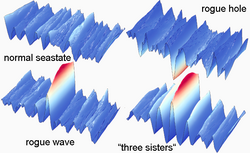 Abb. 1: Numerische Simulationen prototypischer Monsterwellenereignisse. Oben links: normaler Ozeanzustand. Oben rechts: Monsterwellenloch. Unten links: (positive) Monsterwelle. Unten rechts: Monsterwellengruppe, auch bekannt als "die drei Schwestern". Nichtlinearitäten werden nur benötigt, um die größere Wahrscheinlichkeit von positiven Monsterwellen zu begründen. Ob Monsterwellen einzeln oder in Gruppen auftreten, hängt von der spektralen Bandbreite des Ozeanzustandes ab.