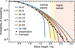 Abb. 2: Wahrscheinlichkeit für das Überschreiten der signinfikanten Wellenhöhe um einen bestimmten Faktor. Gezeigt sind Modellrechnungen für unterschiedliche Anzahlen von überlagerten Elementarwellen. Wenn diese Anzahl kleiner als 10 ist, so können keine Monsterwellen entstehen. Die Gefahr solcher Wellen steigt mit der Zahl der interferierenden Wellen. Wenn Wellen aus verschiedenen Richtungen auf den gleichen Punkt im Ozean zusteuern, so wird die Gefahr von Monsterwellen extrem. Die Abbildung zeigt zum Vergleich das Resultat von Langzeitmessungen so wie die empirisch gefunden Forristall-Verteilung von Wellenhöhen.