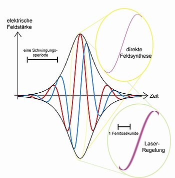 Licht ist eine elektromagnetische Welle sehr hoher Frequenz. Für sichtbares Licht dauert eine einzelne Schwingung des oszillierenden elektrischen Feldes nur etwa 1200-2500 Attosekunden. In ultrakurzen Lichtimpulsen führt das Licht nur einige wenige Schwingungen aus. Um die maximal mögliche Feldstärke zu erreichen, muss das Zentrum des Impulses mit einem Maximum des Feldes zusammenfallen, was der in Abb. (rote Linie) gezeigten Phasenlage entspricht. Impulse aus konventionellen Kurzpulslasern weisen starke Schwankungen in der Position der Feldmaxima relativ zum Impulszentrum auf und erreichen nicht stabil die maximale Feldstärke. Deshalb wurden in den letzten Jahren Verfahren entwickelt, mit denen die Lage der Feldmaxima, das heißt die Phase der Lichtschwingung, stabilisiert werden kann.