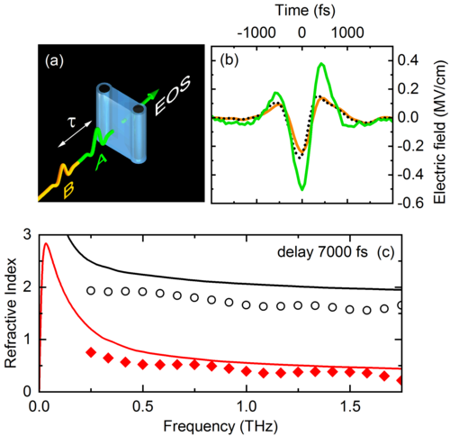 Abb. 2 Zweidimensionale Terahertz (2D-THz) Spektroskopie. (a) Schema des Experiments. Zwei um die Verzögerungszeit t getrennte THz-Impulse A (Anregung) und B (Abtasten) wechselwirken mit einem dünnen Wasserstrahl (blau, Dicke 50 µm). Das durchgelassene THz-Feld wird mit einem phasenempfindlichen Detektor gemessen, der auf dem Prinzip des elektrooptischen Abtastens (ElectroOptic Sampling, EOS) beruht. (b) Zeitlicher Verlauf des elektrischen Feldes von Impuls A (grün) und B (orange). Das nach Anregung durch den Impuls A transmittierte Feld des Impulses B ist als gestrichelte Linie gezeigt (Verzögerungszeit (delay) zwischen Impuls A und B t = 7000 fs). (c) Brechungsindex von Wasser ohne THz-Anregung (durchgezogene Linien) und nach der Erzeugung von Elektronen (Symbole, Elektronenkonzentration 5×10-6 Mol/Liter). Schwarze Kurven zeigen den Realteil des Brechungsindex, rote den Imaginärteil. Letzterer ist proportional zur Absorption des THz-Feldes im Wasserstrahl. Beide Anteile des Brechungsindex werden durch die Erzeugung von Elektronen deutlich verringert.