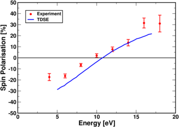 Abb. 1: Spinpolarisation gemessen als Funktion der Elektronenenergie. Die blaue Kurve ist eine theoretische Vorhersage, während die roten Punkte mit Fehlerbalken die experimentellen Ergebnisse zeigen. Die Messung erfolgte für Xe-Atome.