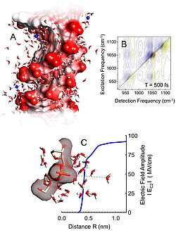 Als Träger der Erbinformation weisen DNA-Moleküle in ihrer natürlichen wässrigen Umgebung eine Doppelhelixstruktur auf, die aus zwei gegenläufigen gewundenen Strängen von Nukleotiden aufgebaut ist (Abb. 1A). Eine alternierende Anordnung negativ geladener Phosphatgruppen und polarer Zuckereinheiten bildet das Rückgrat der Doppelhelix welches direkt mit den umgebenden Wassermolekülen wechselwirkt. Die insgesamt negative Ladung der Doppelhelix wird durch positiv geladene Gegenionen, z.B. Natriumionen kompensiert, die sich in wässriger Umgebung dicht an der Helixoberfläche befinden. Die Wechselwirkung von elektrischen Dipolmomenten der Wassermoleküle mit den Ladungen der Gegenionen und Phosphatgruppen sowie mit den polaren Einheiten erzeugt elektrische Felder an der DNA-Oberfläche, deren Eigenschaften trotz intensiver Forschung bis heute kontrovers diskutiert werden. Dies liegt wesentlich an der strukturellen Komplexität dieses Vielteilchensystems und seinen thermischen Fluktuationen auf kurzen Zeitskalen.