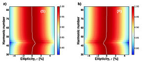 Abb. Berechnungen zur Elliptizitäts-Abhängigkeit des Hohe-Harmonische Signals in S-Epoxypropan (a) und R-Epoxypropan (b) bestätigen, dass das chiral-empfindliche Signal besonders stark um die Harmonischen 41-43 ist, wo die primären (chiral-unempfindlichen) Hohe-Harmonische Kanäle XX und AA destruktiv interferieren. Für jede Harmonische wurde das Signal mit ihrem entsprechenden Elliptizitäts-abhängigen Maximum normiert.