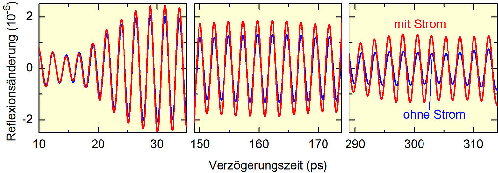 Abb. 1 Änderungen der Reflexion als Funktion der Verzögerungszeit nach dem Pump-Puls. Die beobachteten Oszillationen sind proportional zur momentanen Amplitude der Schallwelle. Die blaue Kurve zeigt die Ergebnisse ohne Strom durch das Übergitter, die rote Kurve mit einem Strom von 1 A. Die Amplitude mit Strom ist immer größer als die ohne Strom. Die Verstärkung (das Verhältnis zwischen den roten und blauen Kurven) ist am deutlichsten bei Verzögerungszeiten über 300 ps (1 ps ist eine Pikosekunde, ein Millionstel einer Millionstel Sekunde), da die Verstärkung Zeit braucht.