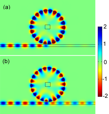 In einer zweiten Publikation schlug die Gruppe eine neue Variante eines Nanometer plasmonischen Modulators vor, der aus einem Metall-Isolator-Metall Wellenleiter und einem seitlich angekoppelten magneto-optischen Scheibenresonator beruht und durch ein äußeres magnetisches Feld gesteuert wird (siehe Abb. 3). Eine Änderung der Wellenzahl und der Transmission von SPP Moden kann durch eine Änderung des magnetischen Feldes bewirkt werden. Ein/Aus-Umschaltung von laufenden SPP Moden durch dieses Bauteil infolge einer Richtungsumkehr des magnetischen Feldes wird durch die numerische Lösung der Maxwell Gleichungen demonstriert. Eine Resonanzüberhöhung der magneto-optischen Modulation von mehr als einem Faktor von 200 führt zu einer Kontrastrate von mehr als 90% bei einer moderaten Durchgangsdämpfung innerhalb einer Bandbreite von mehr als 100 GHz. Abb.4 zeigt die Verteilung der magnetischen Feldkomponente der SPP Moden bei einer Gyration von g=0.03 und g=-0.03. Wie zu sehen ist, führt eine Änderung der Richtung des äußeren magnetischen Feldes infolge der Änderung des Interferenzmusters von einem "Aus" zu einem "An"-Zustand des magneto-plasmonischen Modulators.