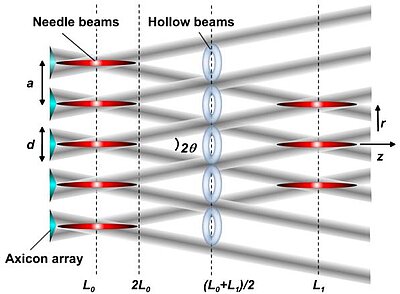 Fig. 1: Nondiffractive or geometrical Talbot effect as periodical constructive interference behind an array of axicons of (a = period, d = element diameter, θ = half-conical beam angle, schematically). Needle beams and ring-shaped hollow beams appear alternatingly (L0: intensity maxima of first focal zones, L1: first nondiffractive Talbot distance; (L0+L1)/2: hollow beams with dark central regions) [1].