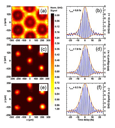 Fig. 2: Temporal self-imaging of few-cycle pulses demonstrated by spatially resolved autocorrelation at nondiffractive Talbot planes behind a hexagonal array of programmed axicons (d = 230 µm, a = 445 µm). Intensity profiles (left) and 2nd order autocorrelation (right) are shown for dark rings at (L0+L1)/2 = 60 mm (a,b), first nondiffractive Talbot distance L1 = 105 mm (c,d), and second nondiffractive Talbot plane L2 = 195 mm (e,f) [1].