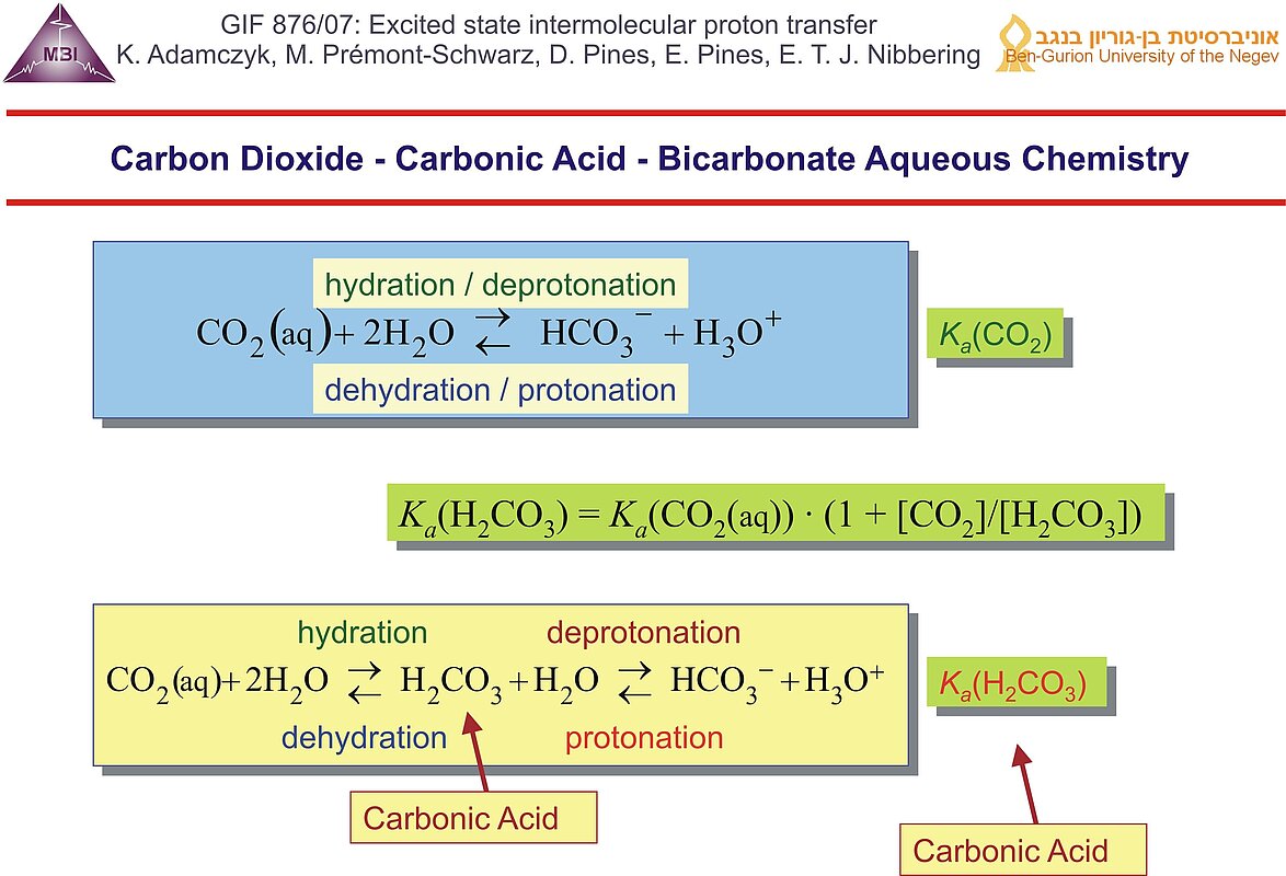11. Aqueous carbon dioxide chemistry is usually described using an equilibrium between CO2/H2O and HCO3-/H3O+, with the effective acid dissociation constant Ka(CO2) for which pKa = 6.35. In reality the hydration/dehydration and deprotonation/protonation steps have to be treated separately, with carbonic acid as intermediate. Carbonic acid has not been directly observed in aqueous solution, and as a result the real acidity of carbonic acid has only been roughly estimated to be pKa ~ 3.6 .