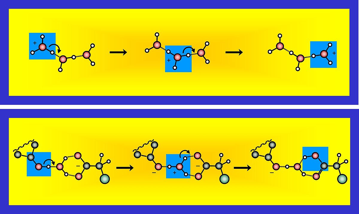 9. Several proton transfer pathways between acids and bases having different number of water molecules as bridge can be considered. Because proton transfer reactions are typically reversible, many peripatetic pathways may play a key role in the solution phase dynamics. The phrase "peripatetic" in this context has been used first by Casey Hynes, see his News & Views commentary published in 2007 on this.