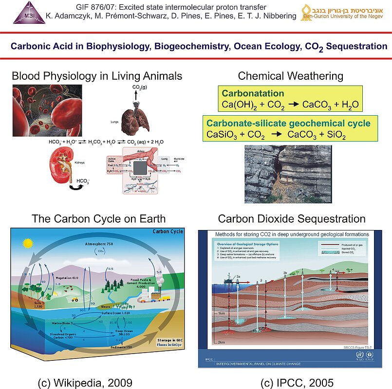 14. The facts that carbonic acid has an acidity between that of chloroacetic acid and formic acid, and the carbonic acid is relatively long lived suggests strongly the possibility that carbonic acid plays a key role as an intact molecule in the CO2 household in living animals, in chemical weathering of rock formations, in the CO2 household of Earth and in CO2 sequestration schemes where water is present.