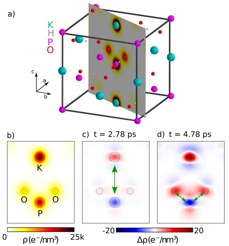 Abbildung 3 zeigt zeitabhängige Elektronendichtekarten von paraelektrischem KDP für zwei unterschiedliche Verzögerungszeiten zwischen Anreg- und Abtastimpuls nach einer kohärenten Anregung der soft mode [2]. Die Schwingungsbewegung der Atomkerne führt zu einer lang anhaltenden Schaukelbewegung der Elektronen zwischen verschiedenen Atomen in der Einheitszelle aufgrund des longitudinalen Charakters der soft mode. Dieses Verhalten steht im krassen Widerspruch zu Vorhersagen der bisherigen Literatur, die bislang von einem transversalen Charakter dieser Phononen ausging. Die Elektronendichtekarten zeigen sowohl einen Elektronentransfer zwischen Kalium- und Phosphoratomen [Teilbild (b)] wie auch eine ausgeprägte Elektronenumverteilung innerhalb des Phosphat-Ions von den Phosphor zu den Sauerstoff-Atomen [Teilbild (c)].