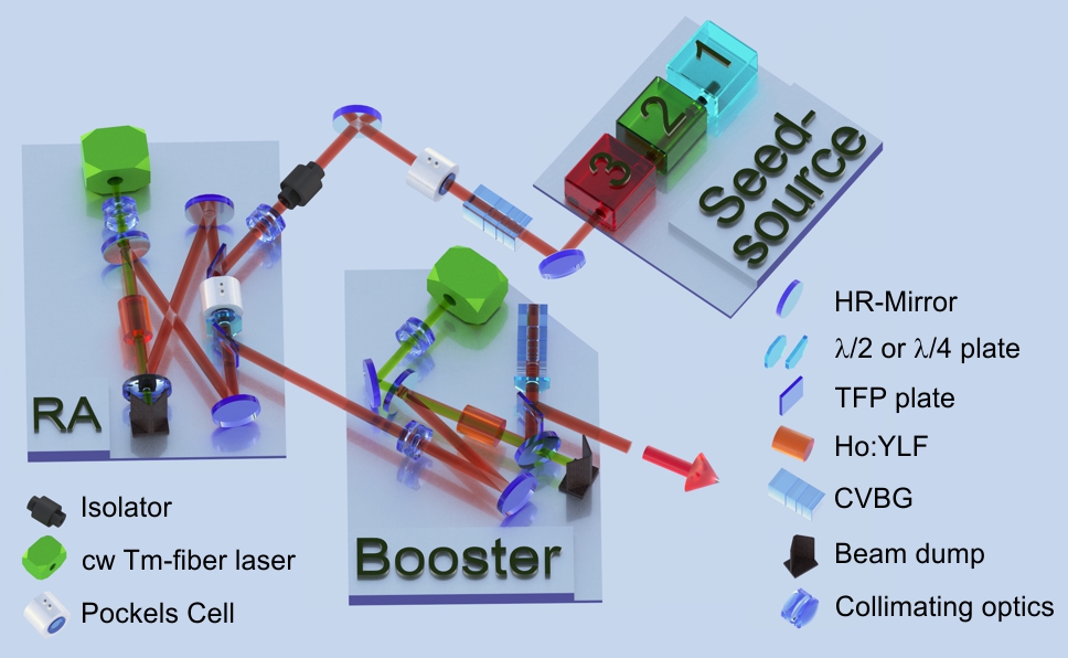 Fig. 1. High power 2 µm laser delivering pulse energies of up to 55 mJ. The seed-source is a three-stage system consiting of a fs Er:fiber laser, a super-continuum highly nonlinear fiber and a Tm:fiber pre amplifier. After 24 round trips a state of operation is reached where the regenerative amplifier emits stable pulses (rms < 0.3 %) of around 10 mJ at 1 kHz. A booster (two Ho:YLF crystals) stage raises the pulse energy to > 50 mJ.
