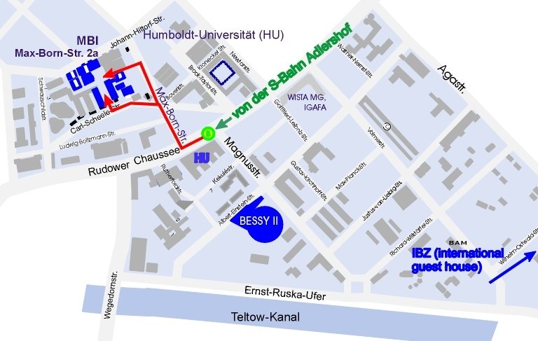 The Max Born Institute at Max-Born Straße 2A is located on the grounds of the Technology Park in Berlin-Adlershof. This district is located in the southeast of Berlin, only a few kilometers from Berlin-Schönefeld Airport. To reach the institute there are several possibilities. You can orient yourself in the given direction and in the linked map. Look for a complex of several buildings whose facade is covered with metal.