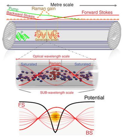 Mechanism of line narrowing in continuous-wave-pumped fiber filled with Raman-active gas. Forward- and backward- propagating Stokes waves create a standing wave and a periodic lattice of population difference, which results in an array of deep subwavelength potential traps.