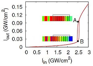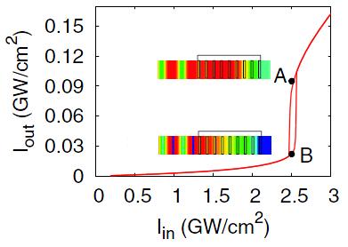 Bistable optical transmission in a planar nonlinear metal-dielectric array. A metal-like state B reflects incoming light; a dielectric-like state transmits light and has positive dielectric function due to nonlinearity.