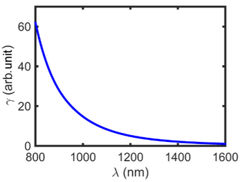 Fig. 2: Dependence of the IFE-related nonlinear susceptibility on the wavelength for a boundary layer between gold and a ferromagnetic dielectric material.