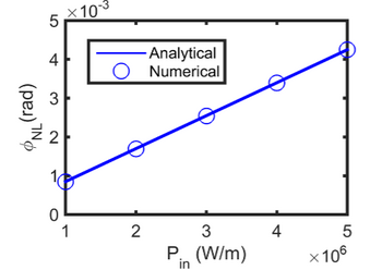 Fig. 3: Dependence of the non-linear phase shift on the power at a wavelength of 1550 nm and a propagation length of 1000 nm.