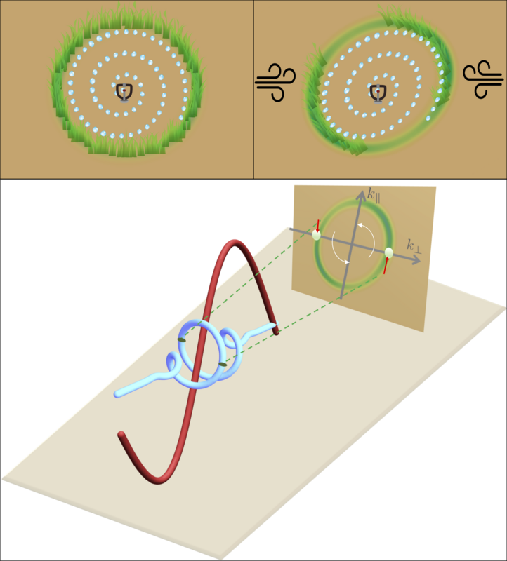 Fig. 1: A quiet sprinkler distributes the water evenly in a circle and the grass grows in a circular pattern - regardless of whether the sprinkler turns clockwise, counterclockwise or randomly. When the wind blows, the grass gets unevenly wet - this is also reflected in its growth. But when the wind changes direction in sync with the sprinkler's rotation, it causes grass growth to be asymmetric. This makes it possible to reconstruct the spin feature of the sprinkler - whether it is a precise, regularly rotating sprinkler or a cheap specimen that rotates at random.