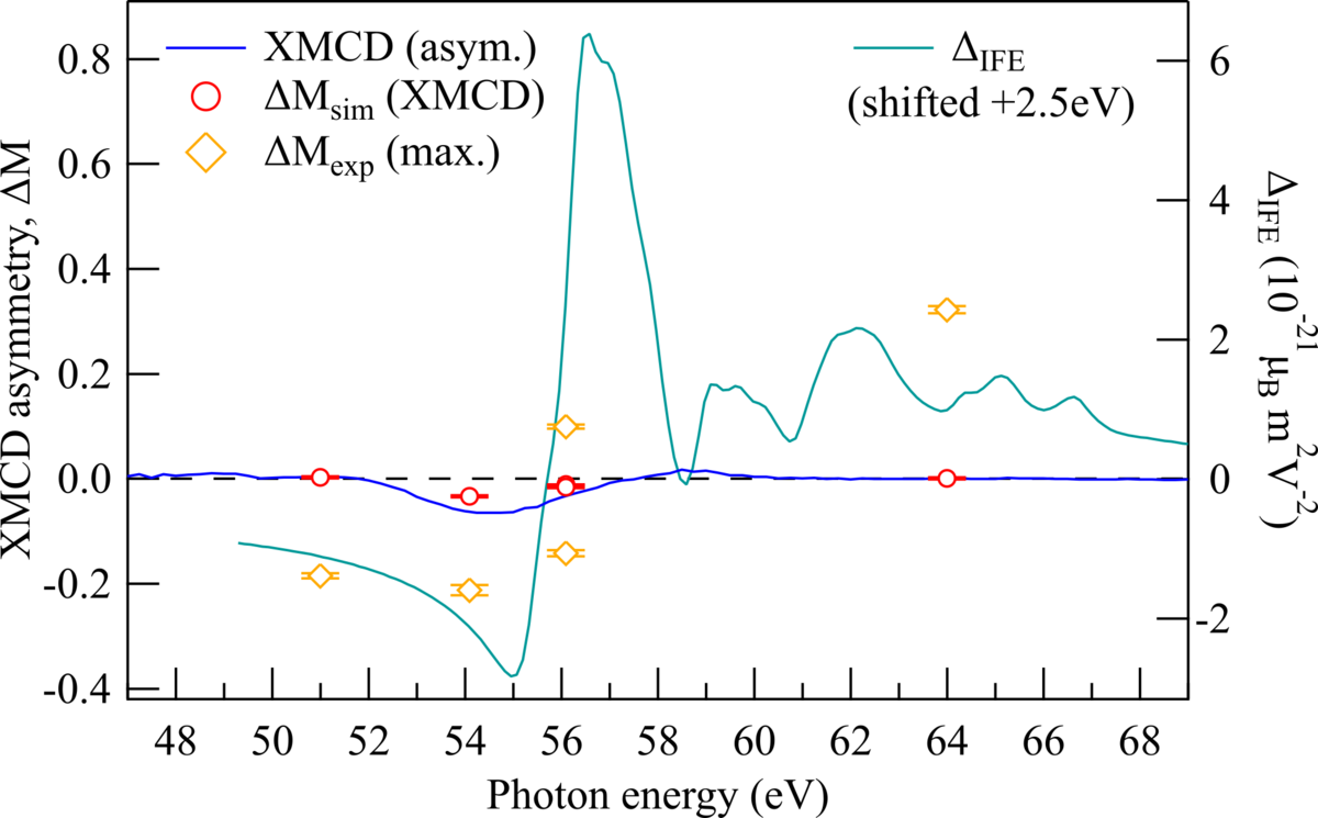With this approach, the scientists could show that, for different XUV photon energies around the Fe M3,2 core-level resonance, the IFE-induced magnetization can reach up to 20-30% of the ground-state magnetization of the alloy, measured by the difference between the ultrafast demagnetization induced for opposite helicities of the circularly polarized XUV pulses (Fig. 1). Supported by ab initio theory and spin dynamics simulations, it could also be demonstrated that the observed effects are in line with the expected IFE response (Fig. 2) and cannot be explained by a purely thermal helicity-dependent mechanism, such as the well-established x-ray magnetic circular dichroism (XMCD). Providing an efficient method for the non-thermal generation of large magnetization on ultrafast time scales, these findings are expected to be of high relevance for the fields of ultrafast magnetism and spintronics, as well as coherent magnetization control and the science of nonlinear x-ray matter interactions.