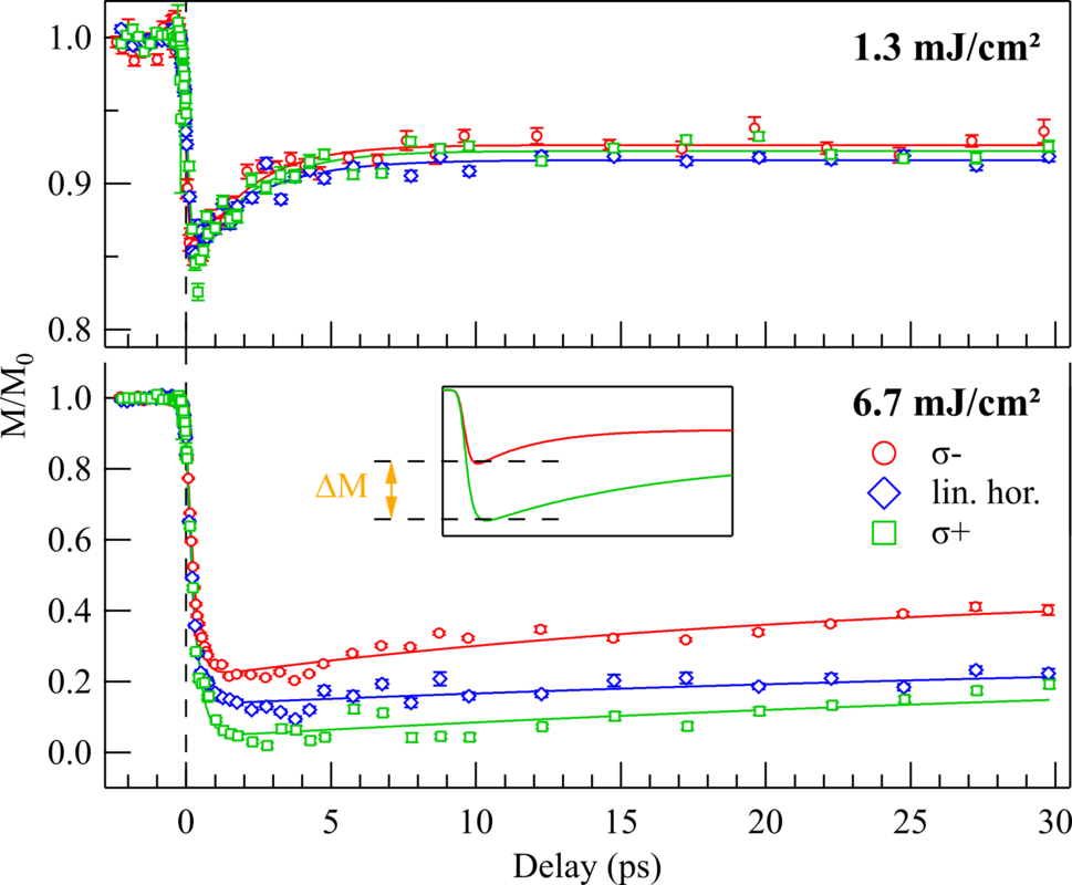 An international team of researchers, led by scientists from MBI, has now studied an entirely different, non-thermal pathway of manipulating magnetism by light. Their approach is based on an opto-magnetic phenomenon that does not rely on electronic heating induced by the absorption of the light, but rather on a direct, coherent interaction between the light’s polarization and the electronic spins. The underlying mechanism is the inverse Faraday effect (IFE), which leads to the generation of magnetic moments in a medium optically excited by circularly polarized radiation, with the direction of the magnetization depending on the left- or right-handedness of the circular polarization, i.e., its helicity. However, as the metallic and highly absorptive properties of most ferro- and antiferromagnetic materials typically suppress the aforementioned non-thermal effects, a special technique had to be developed to generate a sizeable opto-magnetic response: Using circularly polarized femtosecond pulses of extreme ultraviolet (XUV) radiation, generated at the free-electron laser FERMI, the scientists could demonstrate the generation of a particularly strong IFE-induced magnetization in a metallic, ferrimagnetic iron-gadolinium (FeGd) alloy. This is possible because of the high photon energy of the XUV radiation, allowing resonant excitation of tightly bound core-level electrons, which due to their intrinsic properties (in particular, a strong spin-orbit coupling) facilitate the generation of large opto-magnetic effects.
