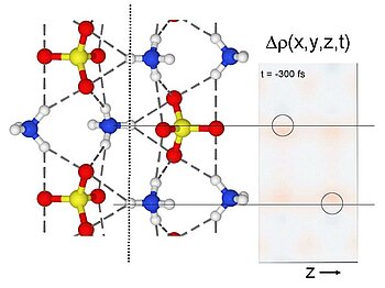 Completely surprisingly, the Berlin physicists observed a reversible chemical reaction, which in principle differs from the known slow, i. thermal phase transitions of ammonium sulfate different. The blue flash of light causes the ammonium ion (NH4) + to give off a proton, ie a positive charge, and the sulfate ion (SO4) - an electron, a negative charge. The liberated elementary particles then combine to form a hydrogen atom, which eventually bounces back and forth between two distinct positions within the crystal. This movement is shown in the attached film. The circles indicate the original position of the protons. The red spots indicate the movement of the hydrogen atoms following the chemical reaction.
