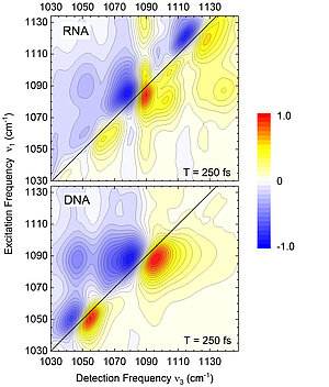 Fig. 2: Two-dimensional vibrational spectra of RNA (top) and DNA (bottom) in the frequency range of the sugar-phosphate vibrations of the backbone. The RNA spectrum has additional bands (contours) along the frequency diagonal ν1 = ν3 and a more complex distribution of extra-diagonal contributions. In addition to the frequency positions, the line shapes of the individual bands (contours) give information about details of the interaction with neighboring water molecules.