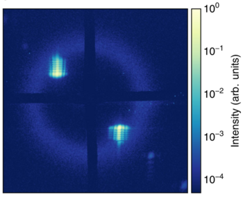 Scientists from MBI and the Italian research institutes ELETTRA and IOM have now demonstrated a method, which allows to take a snapshot picture of the fluence distribution impinging on the sample while at the same time recording the scattering signal of interest generated by that very same FEL shot. The approach relies upon the fabrication of very shallow grooves of only a few nanometer depth into the membrane holding the sample. Via a tailored two-dimensional distortion, this groove pattern forms a diffractive optical element that is designed to image the footprint of the incident x-ray beam on a two-dimensional detector. In the figure below, the beam footprint on the sample is visible (in two conjugate copies) as a spot with a checkerboard of many side maxima and minima, while the magnetic scattering from this sample with ferromagnetic domains is visible as a ring on the very same detector. Using this approach, scientists can now relate a scattering signal from a specimen to the exact incident fluence footprint on this sample, as both originate from the identical x-ray pulse.