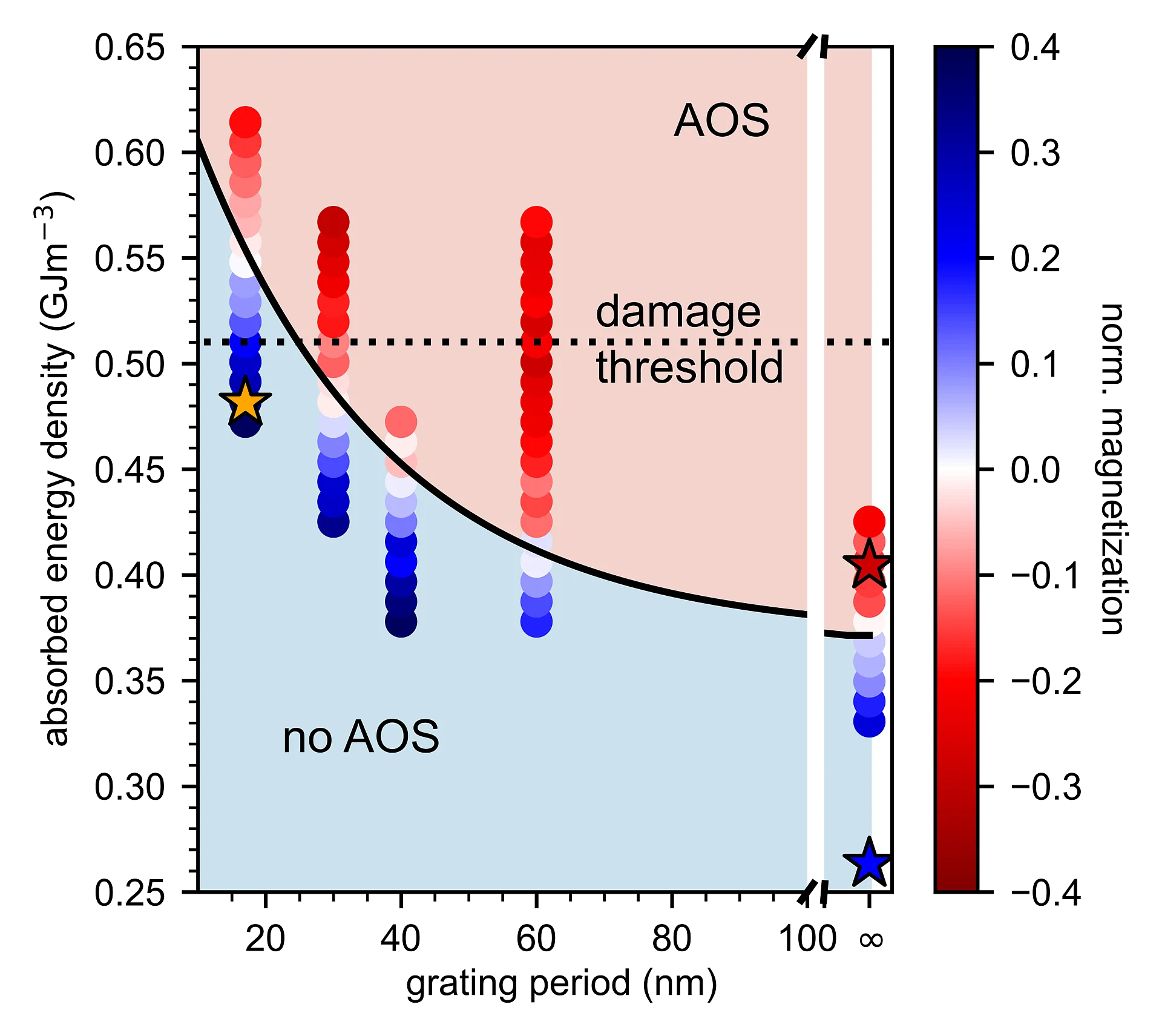 For AOS to take place, the magnetic material has to be heated up to very high temperatures in order for its magnetization to be reduced close to zero. Only then, its magnetization can reverse. The twist in AOS is that it is sufficient to heat the electrons of the material while leaving the lattice of atoms cold. This is exactly what an optical laser pulse does; it interacts only with the electrons, allowing to reach much higher (electron) temperatures with very low power levels. However, since hot electrons cool very rapidly by scattering with the cold atoms, the magnetization must be reduced within this characteristic time scale, i.e. AOS relies on a careful balance between the evolution of the (electron) temperature and the loss of magnetization. It is easy to see that this balance is changed when the excitation is confined to the nanoscale: now electrons can not only lose energy to atoms but also by diffusing out of the nanometer-small hot regions. On the nanoscale all these processes happen on comparable ultrafast time scales, such that the electrons may cool too quickly, the magnetization is not sufficiently decreased, and AOS breaks down.