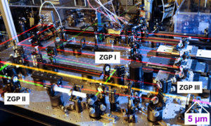 Fig. 1: Experimental arrangement of the three-stage parametric amplifier. The amplification medium is three non-linear ZnGeP2 crystals (ZGP I-III). The optical beam paths are shown in false colors.
