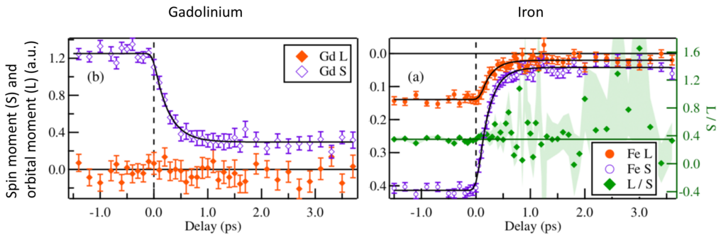 Illumination with an ultrashort laser pulse is a means to demagnetize a material very fast - for the prototypical ferromagnets iron, cobalt and nickel, for example, the magnetization is extinguished within about one picosecond (10-12 s) after the laser pulse has hit the material. This has led to the question, through which channels the angular momentum associated with the magnetization is transferred to other reservoirs during the short time available. Researchers from MBI in Berlin together with scientists from Helmholtz Zentrum Berlin and Nihon University, Japan, have now been able to follow this flow of angular momentum in detail for an iron-gadolinium alloy. In this ferrimagnetic material, adjacent iron (Fe) and gadolinium (Gd) atoms have magnetization with opposite direction. The researchers have used ultrashort x-ray pulses to monitor the absorption of circularly polarized x-rays by the Fe and Gd atoms as a function of time after previous laser excitation. This approach is unique in that it allows tracking the magnetic moment during the ultrafast demagnetization at both types of atoms individually. Even more, it is possible to distinguish angular momentum stored in the orbital motion vs. in the spin of the electrons when the respective absorption spectra are analyzed.