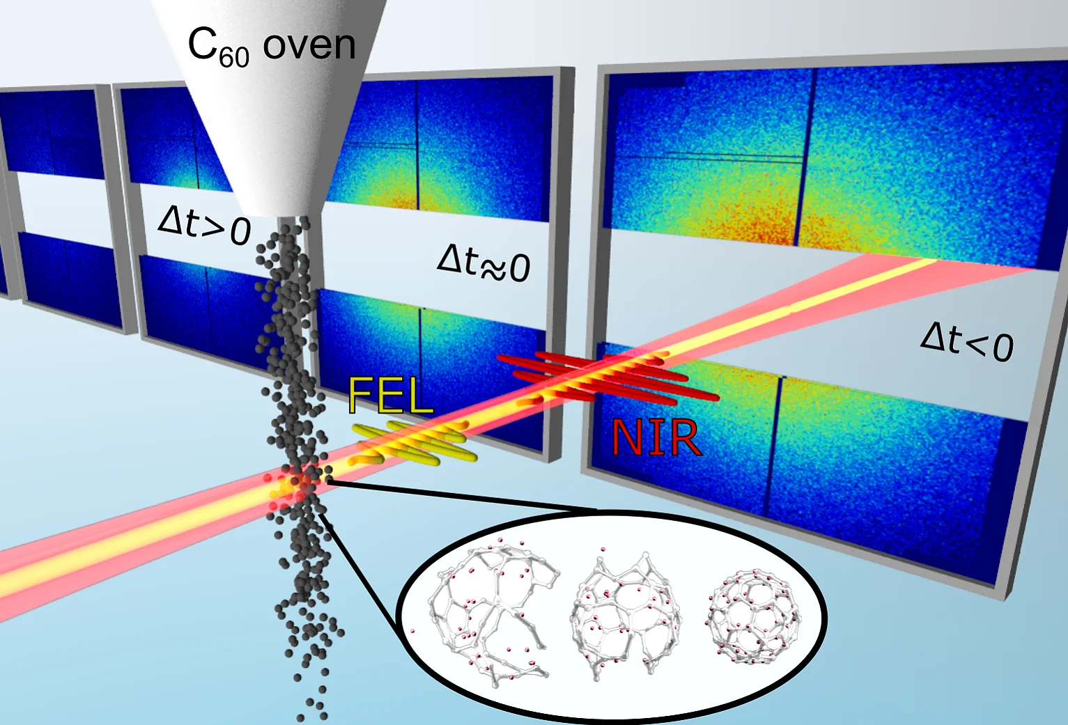In the present publication a different approach was followed by making use of ultra short X-ray pulses available at the LCLS facility: The shape of the C60 molecules was determined taking images of the scattered X-ray photons. This technique basically images the electron distribution within the C60 molecule. Fig. 1 shows a sketch of the experimental setup. An ensemble of C60 molecules was excited and ionized by a near infrared (NIR) pulse. The X-ray pulse interacted with the excited C60 molecules and the scattered photons were imaged by a 2-dimensional detector. To follow the changes of the C60 shape, the delay time Δt between the NIR and the X-ray pulse was varied. By changing the intensity of the NIR pulses different fragmentation scenarios could be studied and compared to theoretical calculations. (see insert in Fig. 1)