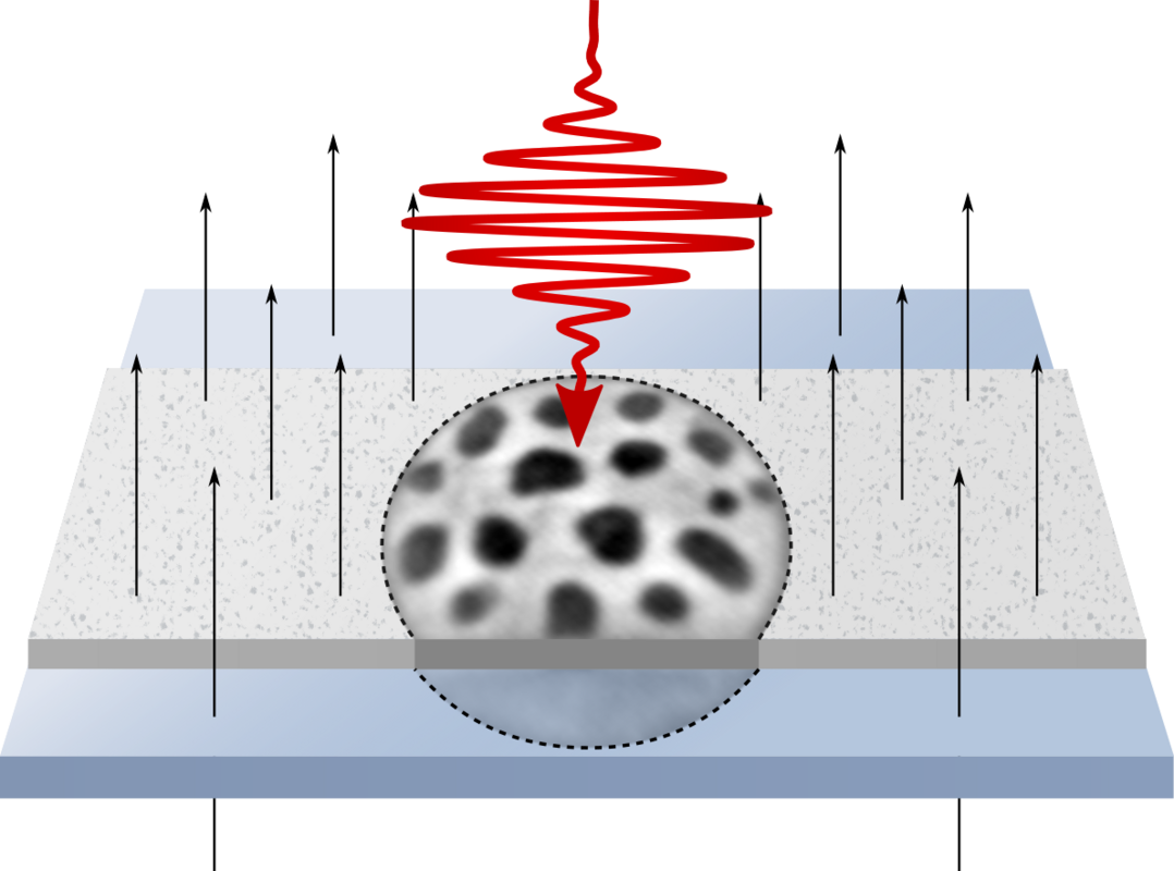 Fig. 1: A single laser pulse of appropriate intensity can create random skyrmion patterns with a density defined by an external magnetic field (thin arrows). This scheme of laser writing of skyrmions may be used as an ultrafast “skyrmion reshuffler” for stochastic computing. The area surrounded by the dashed line marks the field of view of the x-ray microscope used to see the magnetic skyrmions appearing as black dots. The field of view is 1 µm in diameter.
