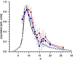 Fig. 2) Comparison of the distribution of the principal quantum number n after excitation of He in strong laser fields: experimentally determined distribution for intensities of 1.8x1015 W/cm2 (blue dots) and 2.9x1015 W/cm2 (red squares). Calculated distribution using the FTI model for 1015W/cm2 (open diamonds) and for 1.4x1015 W/cm2 (open squares).