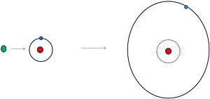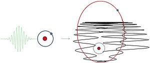 Fig. 1b) A strong laser pulse interacting with the ground-state atom so massively affects the electron's orbit that it relaxes to a higher orbit after the laser pulse is over. The energy of a single photon does not necessarily correspond to the energy of the transition.