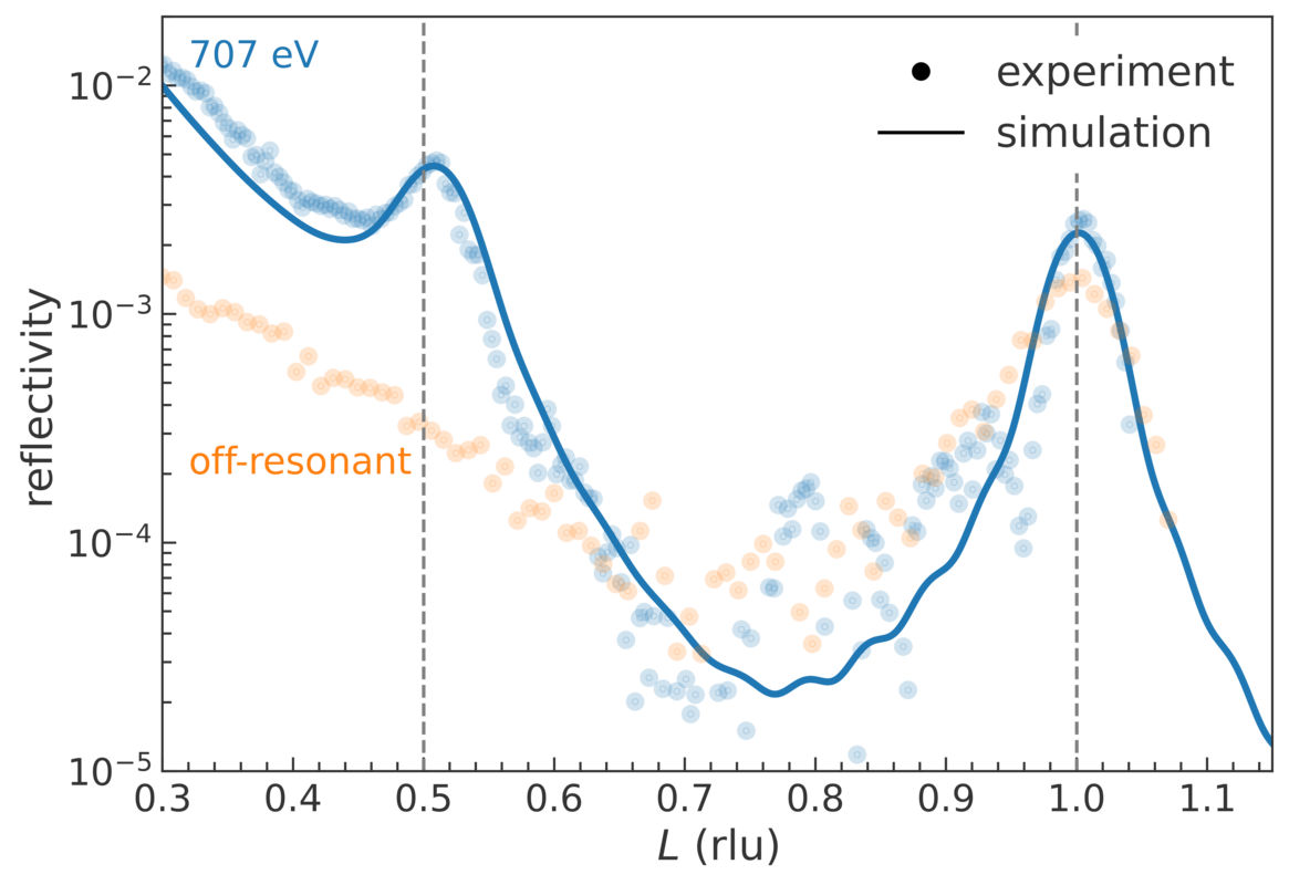 Figure 2: Reflectivity of the artificial antiferromagnet as a function of the normalized angle of incidence, L, of the soft X-ray radiation. The blue and orange circles represent the measured data at different frequencies of the X-ray radiation. The intense reflectivity at L=1 provides direct information about the structural periodicity of the sample and can be measured independently of the light frequency. The increased reflectivity at L=0.5 occurs only for specific, magnetically sensitive light frequencies and is an unambiguous and quantitative measure for determining the strength and periodicity of the antiferromagnetic order in the sample. The blue line shows a very good agreement between experiment and theory.