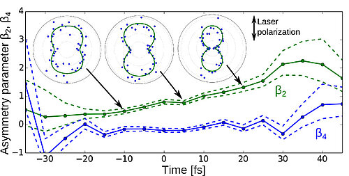 Fig. 1 Angle distribution of photoelectrons generated by the ionization of an auto-ionizing resonance in molecular nitrogen by a weak IR pulse. The embedded windows show the angular distribution for different time delays. The green and blue curves show the time dependence of the asymmetry parameters of the angular distribution. The angular distribution is described here by Legendrepolynome second and fourth order.