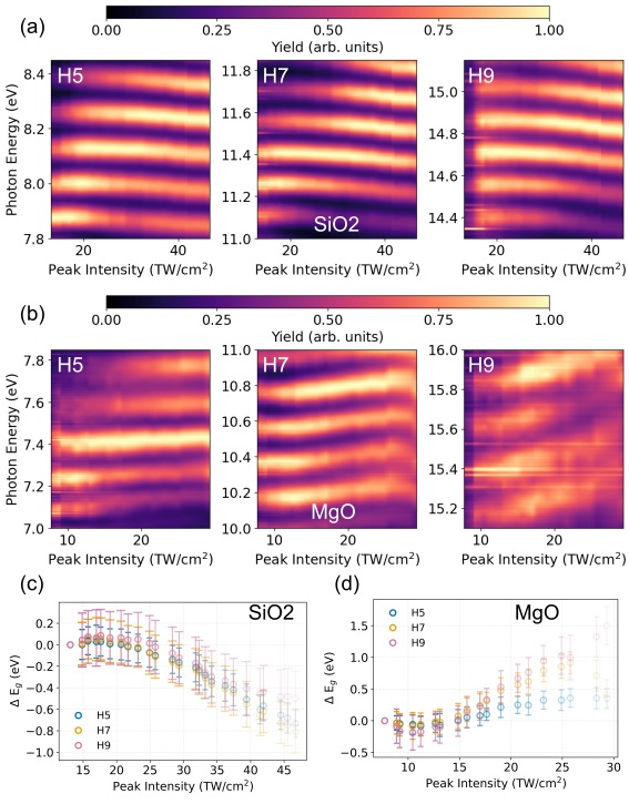 Fig. 2: (a) and (b) Intensity-dependent high-harmonic phase shifts in SiO2(a) and MgO (b). (c) Extracted bandgap variation in SiO2. (d) Same as (c) but for MgO.