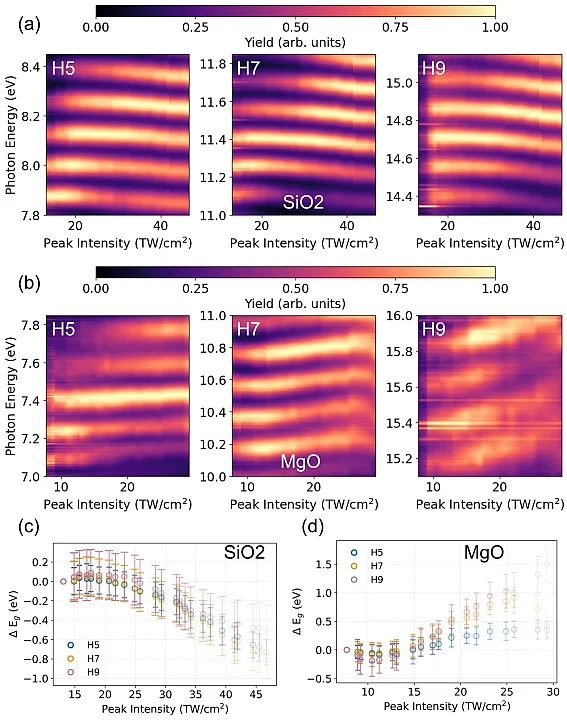 Using pairs of phase-locked near-infrared laser pulses (see Fig. 1 for experimental setup), the team measured interference fringes and their intensity-dependent shift in the generated high-order harmonics from silica glass (SiO2) and magnesium oxide (MgO).