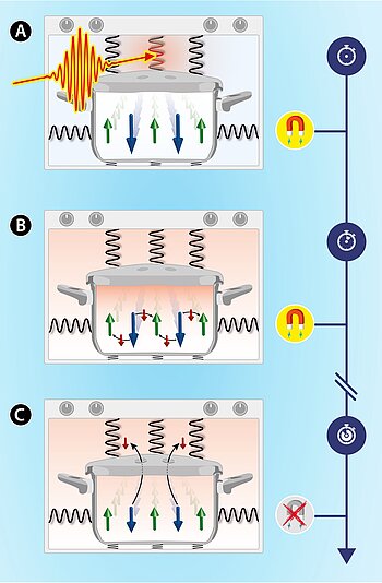 A team of scientists from Berlin (Collaborative Research Center / Transregio 227 Ultrafast Spin Dynamics, Fritz Haber Institute and Max Born Institute), Dresden (Helmholtz Center), Uppsala (Sweden), St. Petersburg (Russia), and Sendai (Japan) have now revealed the elementary steps of this process. "To instantaneously and exclusively heat up the atomic lattice of a YIG film, we use a very specific and novel kind of stimulus: ultrashort bursts of laser light at terahertz frequencies. With a subsequently arriving visible laser pulse, we can then step-by-step trace the evolution of the initially cold magnetic spins. Essentially, we record a stop-motion movie of how the magnetization evolves." says Sebastian Maehrlein, who conducted the experiments. His colleague Ilie Radu from summarizes: "Our observations are striking. We found that sudden heating of the atomic lattice reduces the magnetic order of the ferrimagnet on two distinct time scales: an incredibly fast scale of only 1 ps and a 100,000 times slower scale of 100 ns."