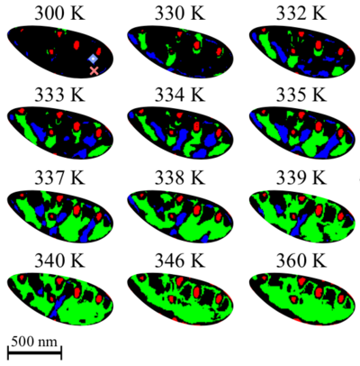 Fig. 2: Images of the phase separation occurring when heating a 75 nm thin VO2 film. The images were acquired via x-ray spectro-holography and are displayed in false color to indicate the different regions: red = defect region, black = M1 phase, blue = M2 phase, green = R phase. Note that some sample regions transition directly from M1 to R (e.g. cross marker) while others transition via the intermediate M2 phase (e.g. diamond marker).