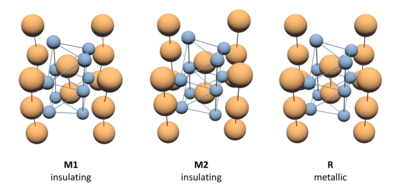 Fig. 1: Crystal structures for the insulating monoclinic phases M1 and M2 as well as for the metallic R rutile structure. Minute changes in atomic positions have a large effect on the material properties. Vanadium atoms are shown in orange, oxygen atoms in blue. Connecting lines are meant as guide to the eye.