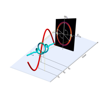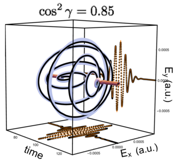 Characterization of attosecond pulses with complex, time-dependent polarization.  Left panel: schematic of the setup, which uses a pair of time-locked pulses: the attosecond pulse and a linearly polarized infrared pulse. Right panel: Angle-resolved spectra recorded as a function of the delay between the asec and IR pulses allow one to fully reconstruct the asec pulse, including degree of depolarization (here 1-0.85=0.15).