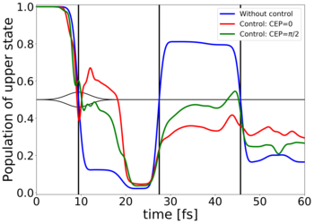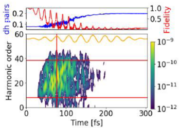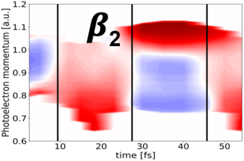 Ultrafast transition through the conical intersection in NO2. Left panel shows population of the upper adiabatic state, vertical lines show when the vibronic wavepacket passes through the conical intersection (CI). Right panel shows how analysis of angle-resolved photo-electron spectra produced by ionization with 1 fsec XUV pulse, specifically the β2 parameter in the expansion of the spectrum in Legendre polynomials, faithfully reproduces the motion through the CI.